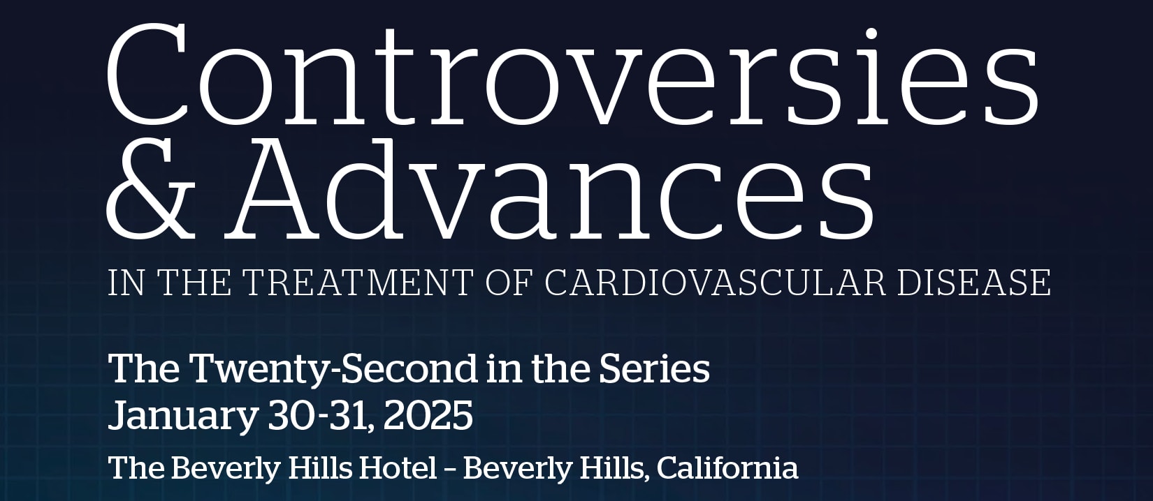 Program Description:We look forward to the twenty-second Controversies and Advances in the Treatment of Cardiovascular Disease symposium and to returning to the beautiful Beverly Hills Hotel this January 30-31, 2025!The two-day scientific program will offer realistic views on many controversial issues in cardiovascular disease today. A faculty of internationally known leaders share their knowledge and experiences with complex and controversial cases.